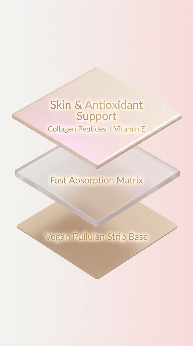 Why it's in a strip: Sublingual delivery means faster absorption into your bloodstream. No capsules breaking down in your stomach. Just direct support for your skin, from within.